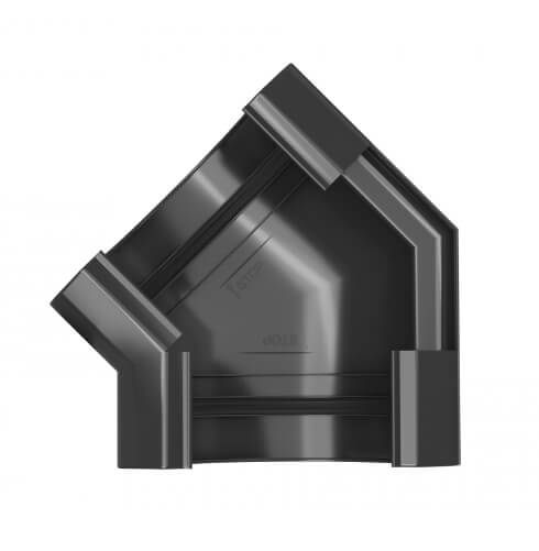 Угол желоба ТЕХНОНИКОЛЬ ПВХ МАКСИ антрацит – связующий элемент в водостоке. Используется, чтобы соединять желоба и корректировать направление потока воды.